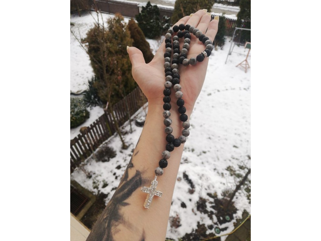 Doplněk do auta se skládá z černé lávy,mapového jaspisu , korálky zdobí bižuterní štrasová rondelka , křížek je také z bižuterního kovu osázený kamínky čiré barvy.